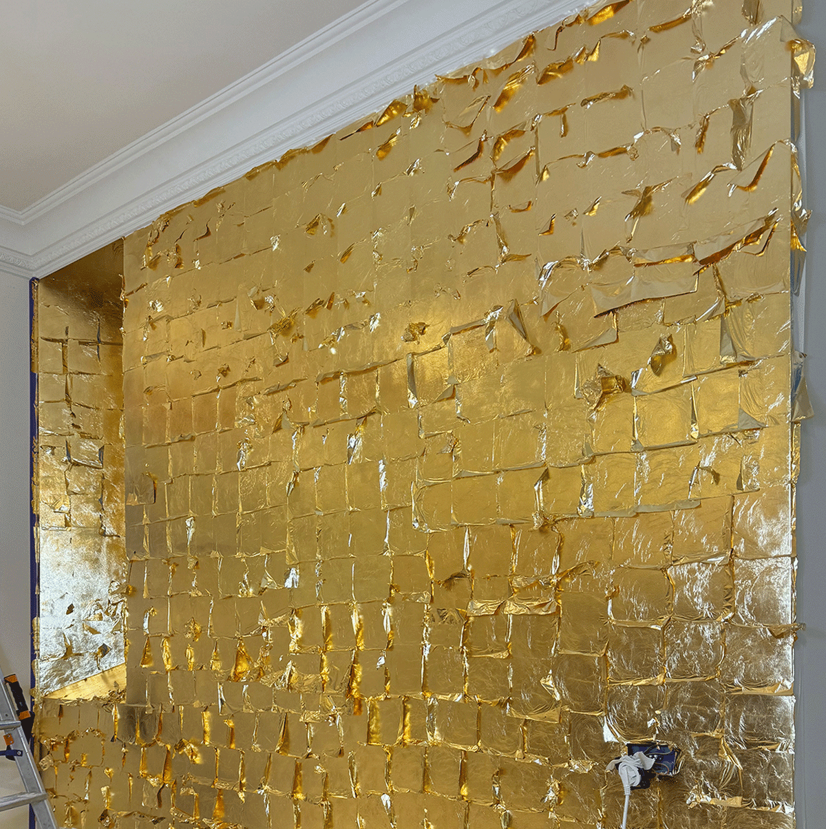 The wall, covered with a gold leaf finish, captures the light and enhances the decor with subtlety. This precious addition harmonizes with the countertop of the furniture, whose marble surface lends the room undeniable elegance.
