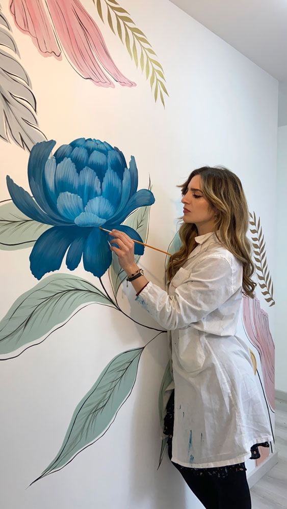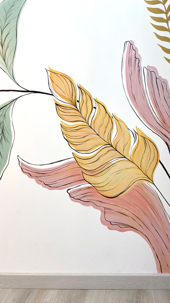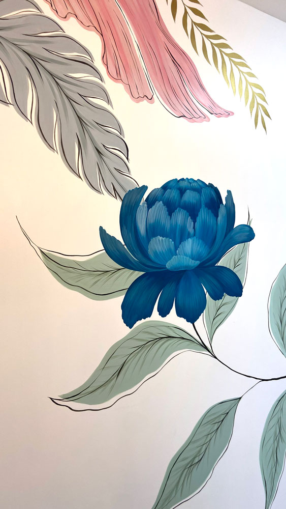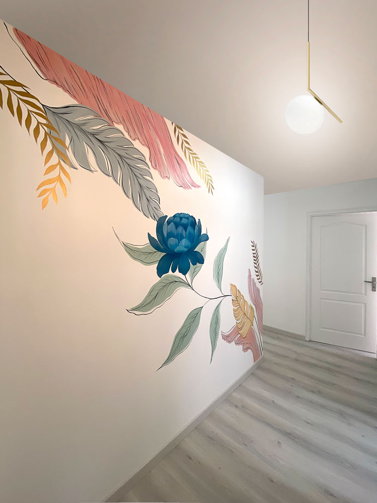 An enchanting wall decoration in a palette of blue and pastel tones, crosses the corridor of the night zone, bringing a touch of artistic and contemporary cheerfulness.