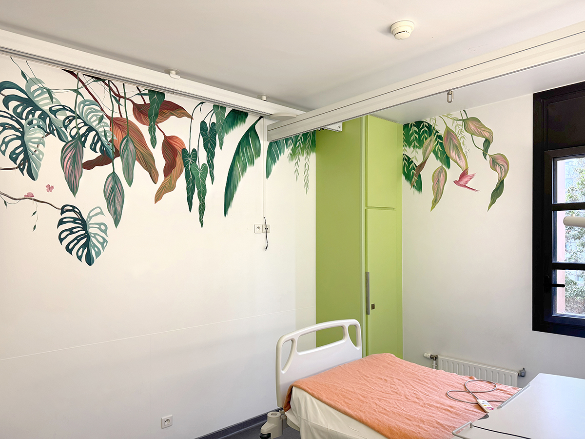 Patients can discover little details hidden in the decorations: birds perched here and there, lucky ladybirds hidden in the illustrations… An invitation to observe and play, which, for a moment, helps to lighten the daily routine and awaken the imagination.