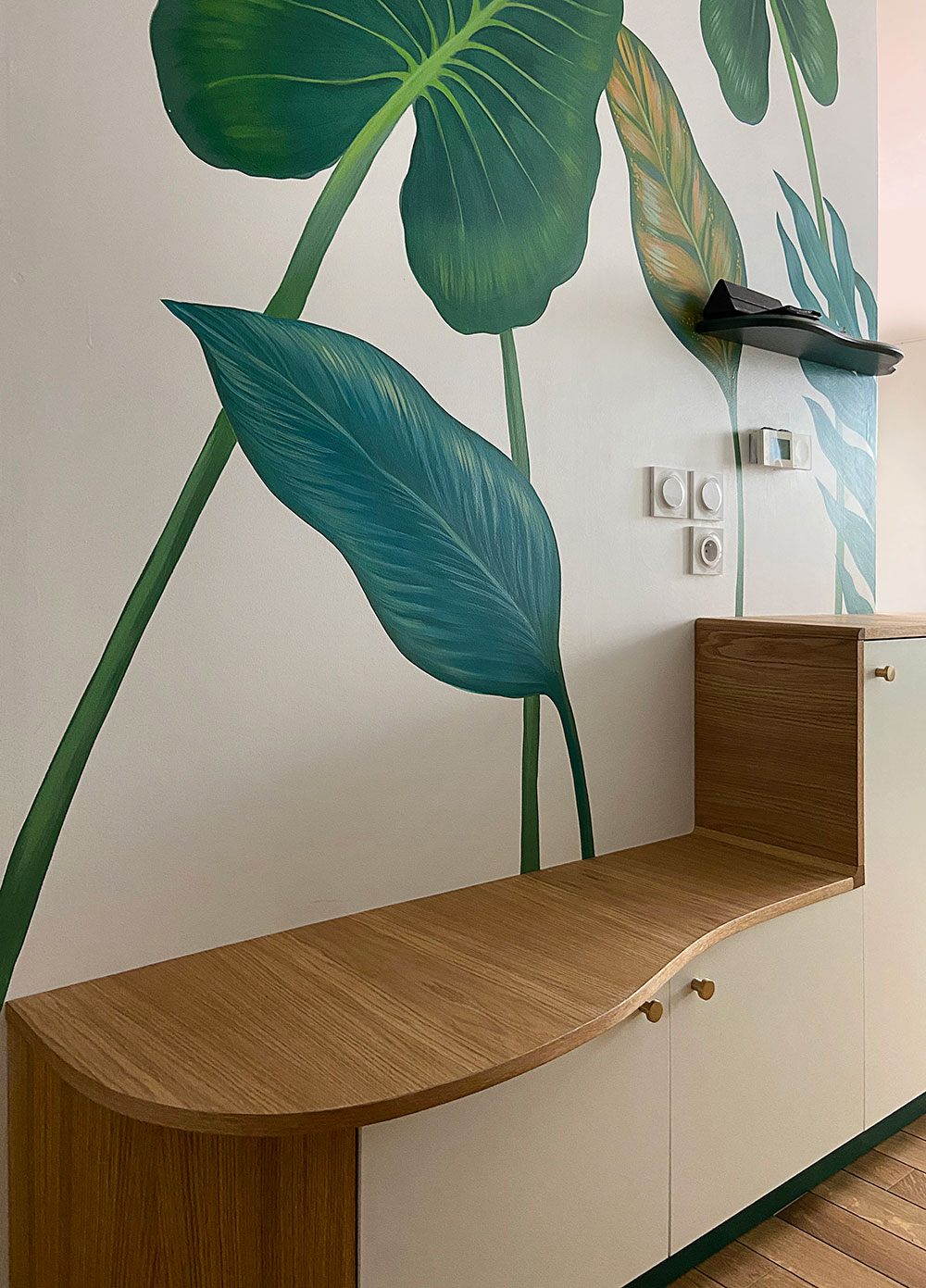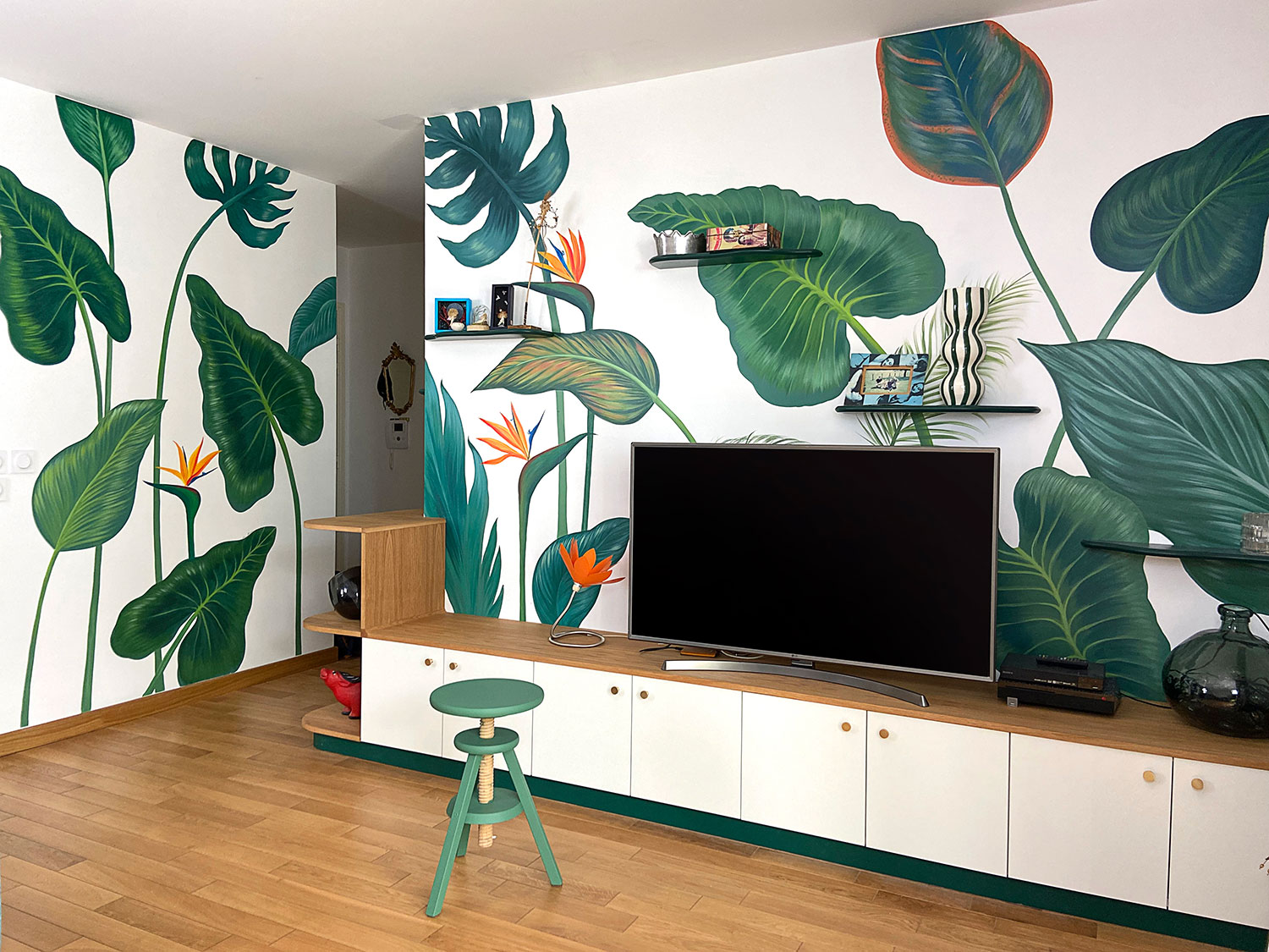 In this apartment in Montreuil, a wall decoration project took shape to realize our customer’s dream: to create a soothing space, a real escape into tropical greenery. Inspired by the desire to immerse oneself in an exotic jungle, the mural features sumptuous tropical leaves and bird-of-paradise flowers, providing a relaxing atmosphere right from the entrance.