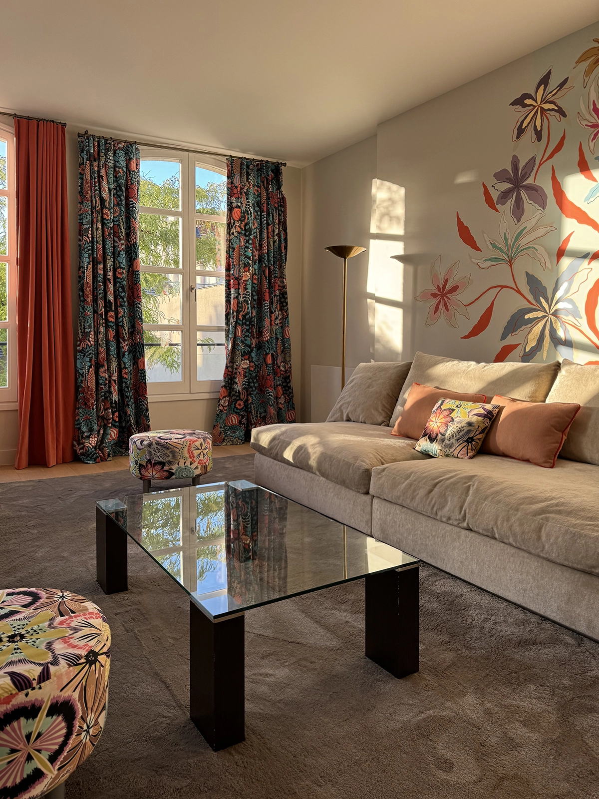 Curtains, furniture and colors harmonize, creating a visual continuity. The patterns chosen are both dynamic and timeless, evoking a touch of retro while meeting the current needs of a modern living space.