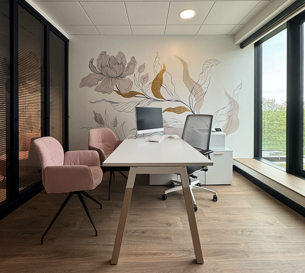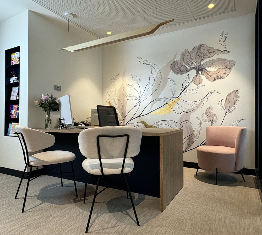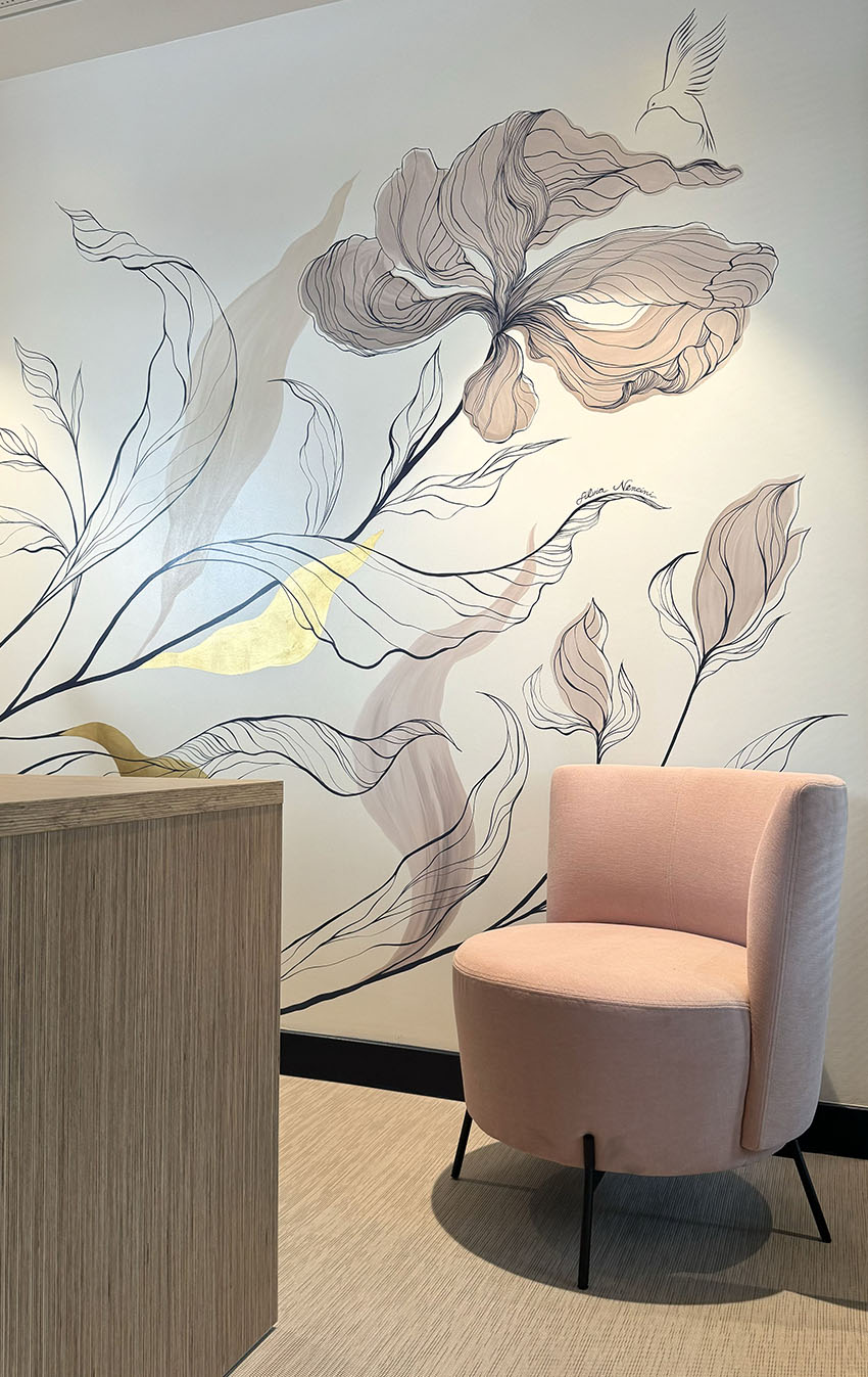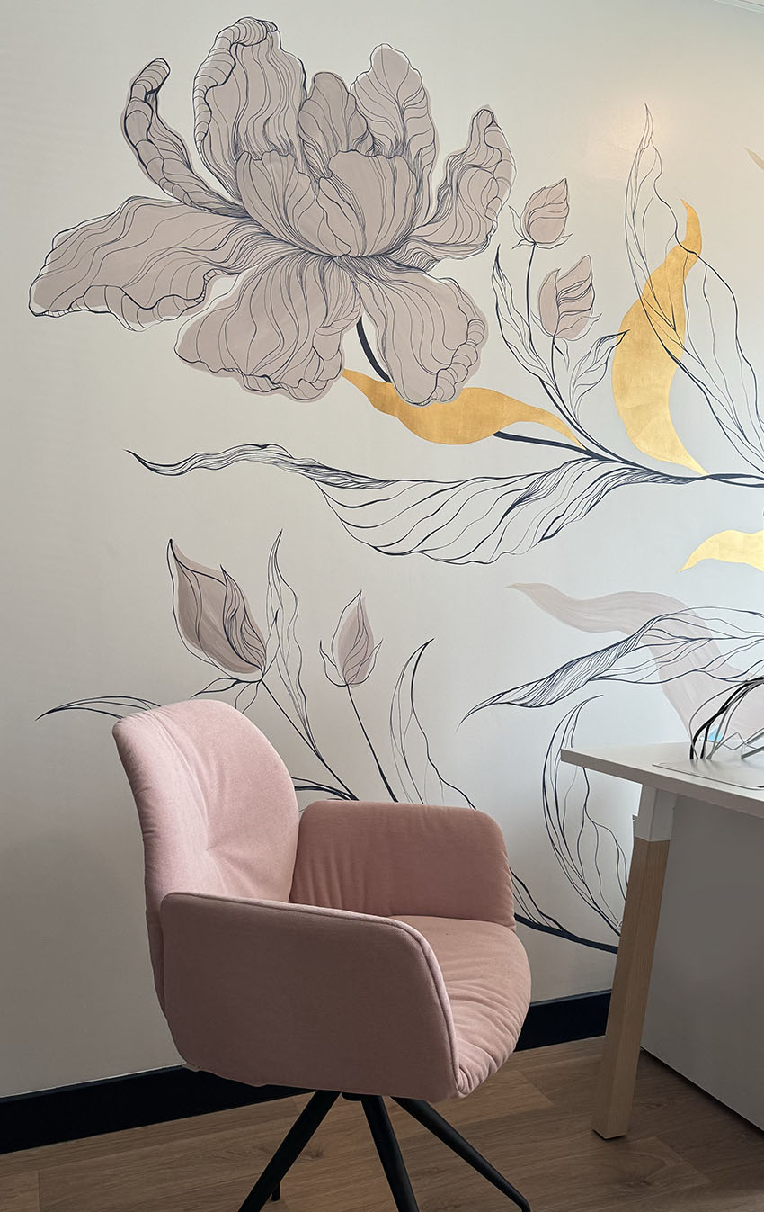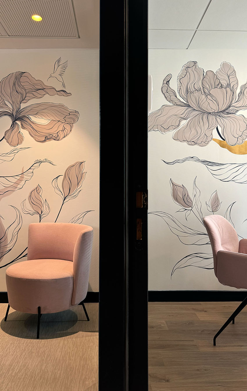 A subtle interplay between powder pink and dark blue, carefully chosen shades in harmony with the gold leaf. These colours are echoed in the architect’s design, where one colour appears to be reflected in a glass roof, but actually reveals a second wall decoration that is both similar and unique. It’s like two flowers trying to meet but never succeeding.