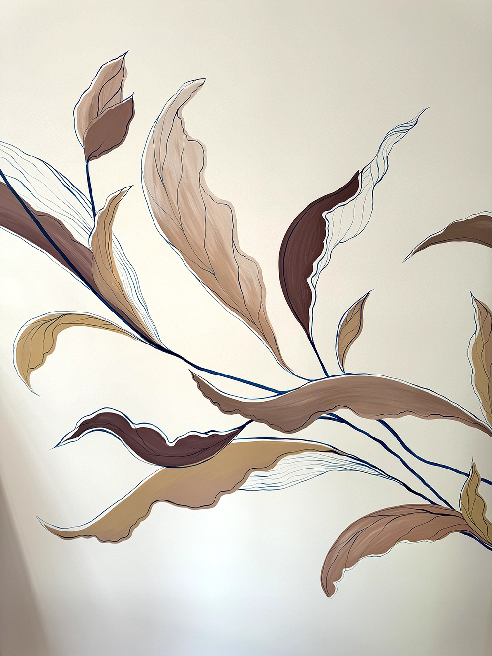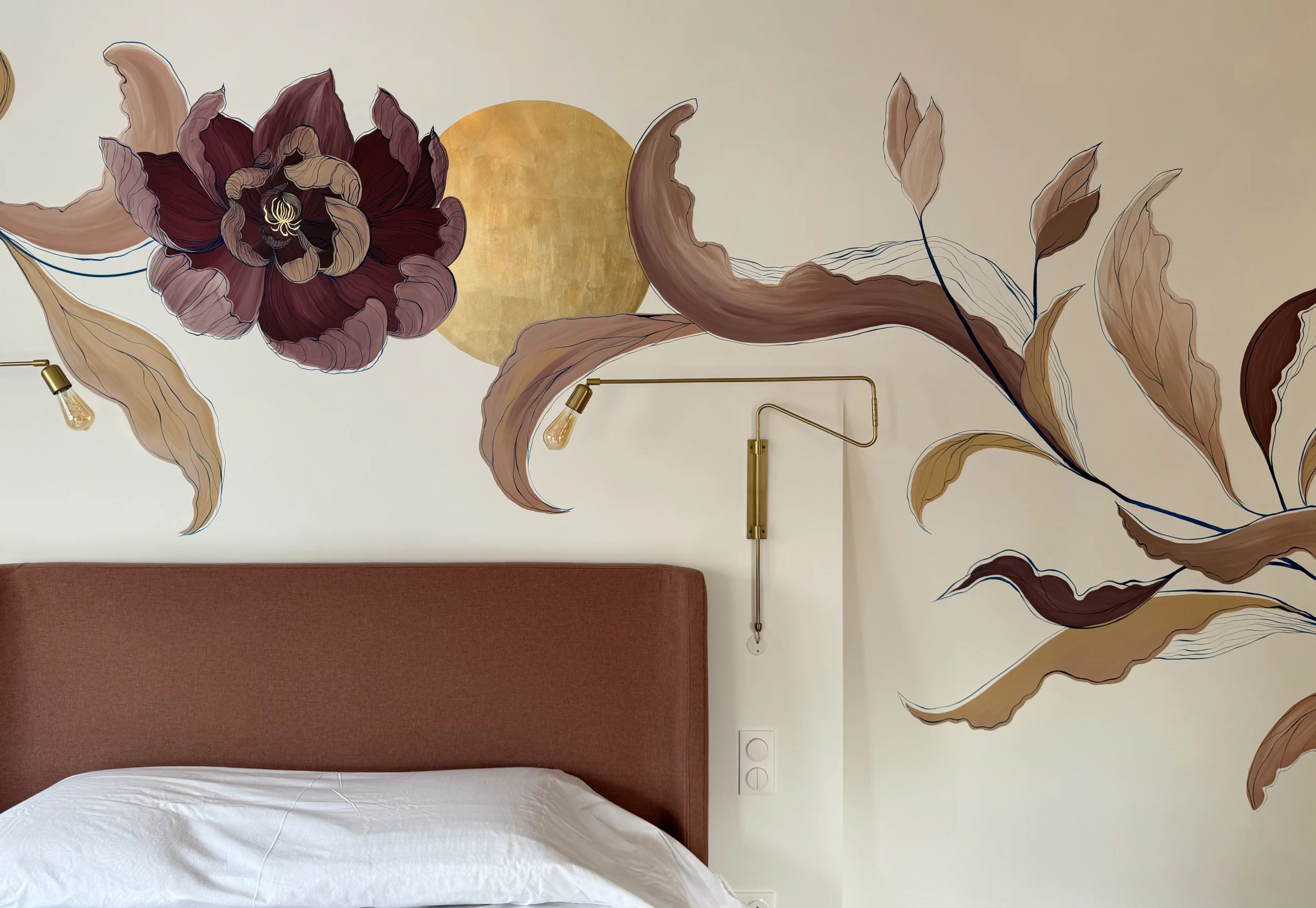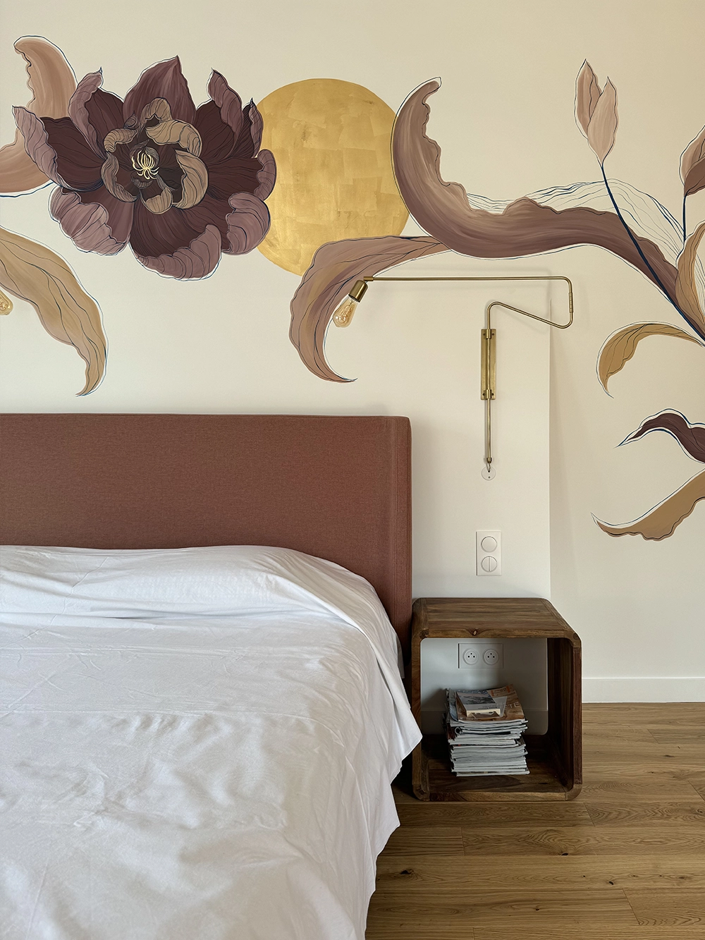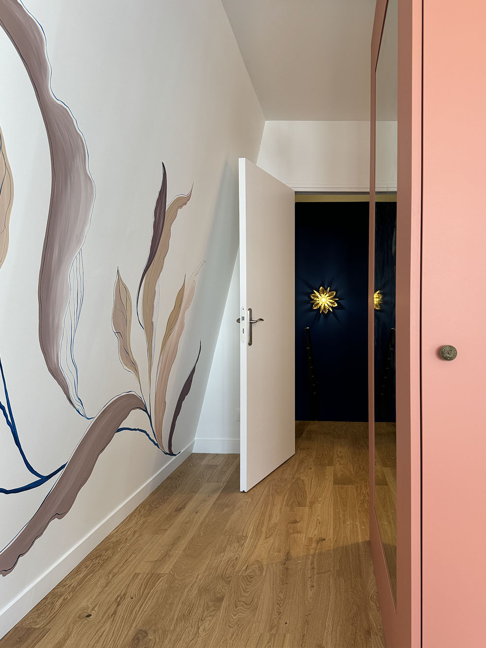 Located on the top floor of this house in Montrouge, this room features a palette of terracotta, powder and ochre tones, which harmonize perfectly with the furniture. The blue lines on the wall echo those of the stairs, creating a fluid visual continuity through the space. A central element in the shape of a golden sun illuminates the room, adding a warm touch and subtly evoking a summer atmosphere.