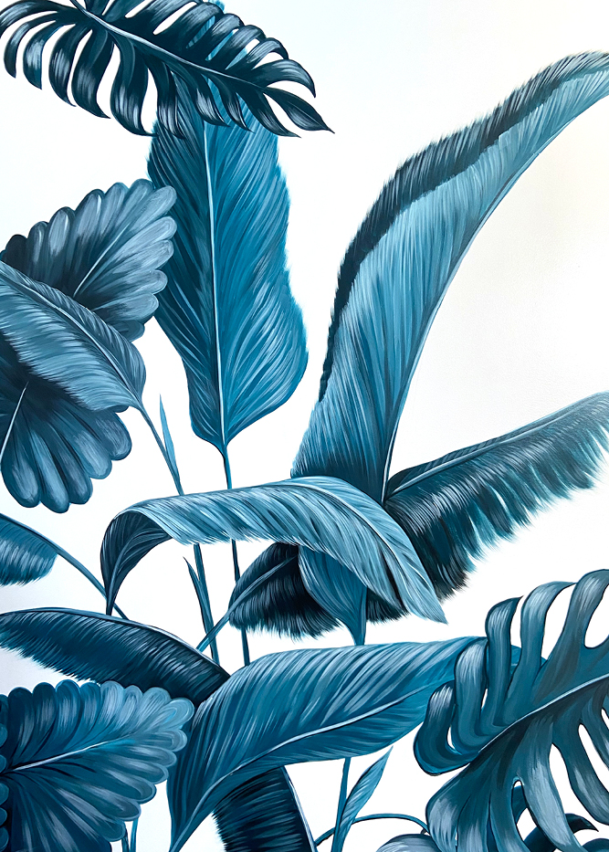 The customer’s visual experience begins with the minimalist gold-coloured sterilisations that accompany the eye through the first part of the restaurant; it then continues in the central corridor with the same tropical motifs and culminates in the large dining room, with a blue forest that harmonises the colours of the walls, creating a chromatic continuum.