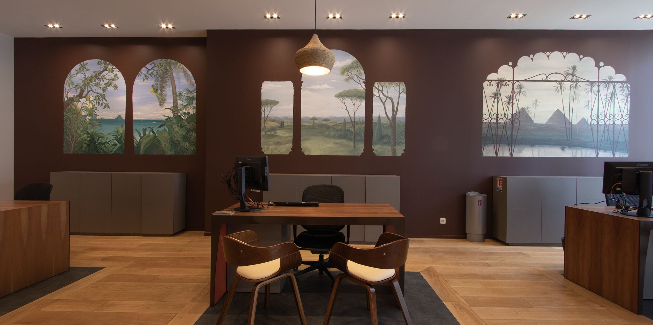 These luminous landscapes stand out against the dark wall, creating an atmosphere that invites escape. Here, the dream of the next adventure begins to take shape, right in the heart of the agency.