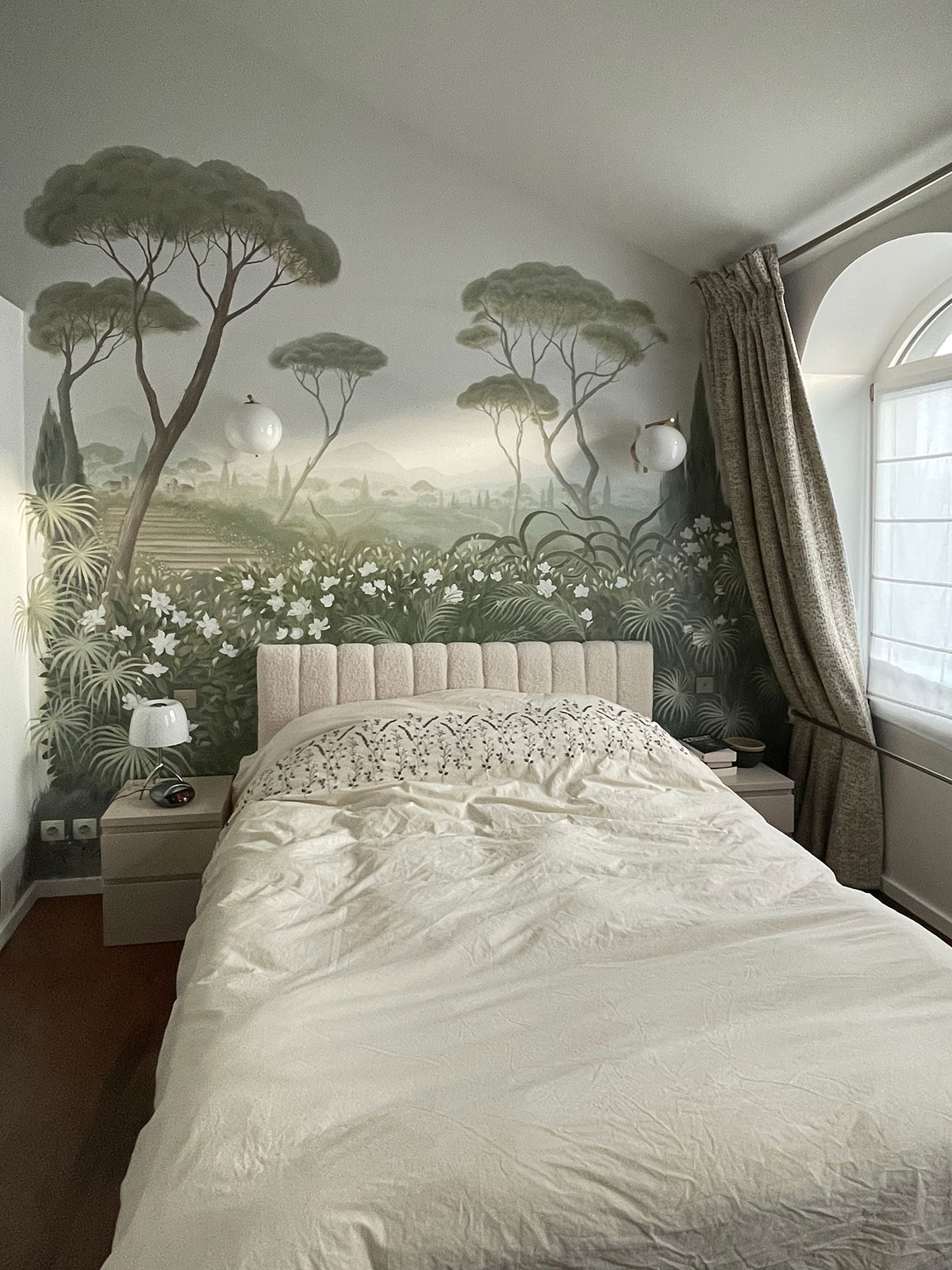 Dans ce projet la nature se marie harmonieusement avec la passion de la cliente pour le vert olive. L’objectif était clair : créer un paysage méditerranéen dans sa chambre à coucher. Des idées ont émergé, se transformant en croquis, puis en photomontages, jusqu’à ce que l’aperçu concret de l’espace personnalisé prenne forme. Ce projet va bien au-delà de simples éléments décoratifs. Il incarne l’histoire et la personnalité de la cliente, lui offrant un espace où elle peut se ressourcer et se retrouver. Chaque détail, chaque couleur, chaque texture a été soigneusement sélectionné pour créer une ambiance entièrement dédiée à son confort et à son bien-être.